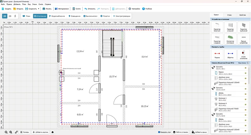 Проложите трубы подачи и обратки, а затем добавьте радиаторы. В программе предусмотрен отдельный каталог для нагревательных устройств. Устанавливайте котлы, насосы, бойлеры и другие модели на план.