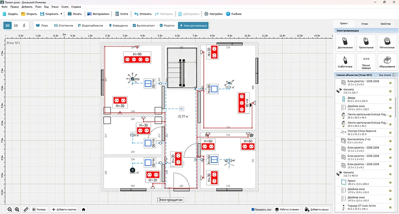 Начните с планировки: начертите стены, укажите их длину и высоту, добавьте дверные и оконные проемы. Домашний Инженер 3D работает в масштабе, поэтому на макете точно будут соблюдены пропорции. Готовый план станет основой для размещения инженерных систем и мебели. А если нужна, например, перепланировка однокомнатной квартиры, просто занесите новые данные в проект и подберите наиболее удобный и технически грамотный вариант.