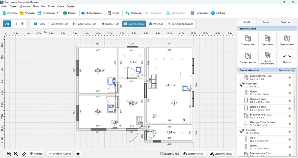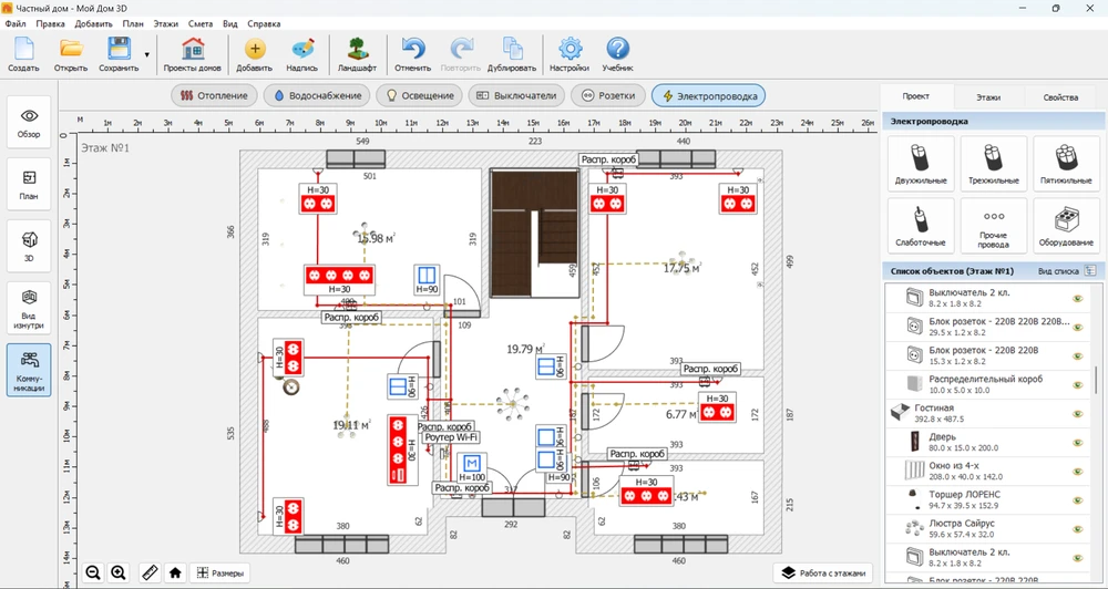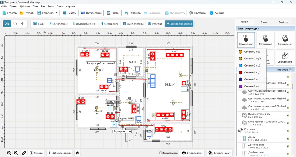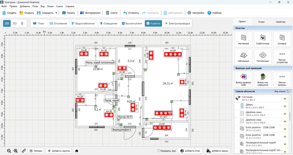Электроснабжению здесь уделено повышенное внимание. Сервис позволяет расставить розетки и выключатели, спланировать слаботочные системы, продумать местоположение щита и распределительных коробок.