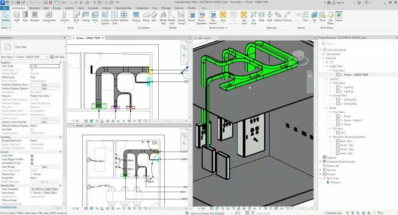 - создание 3D-модели электропроводки внутри архитектурной модели здания;