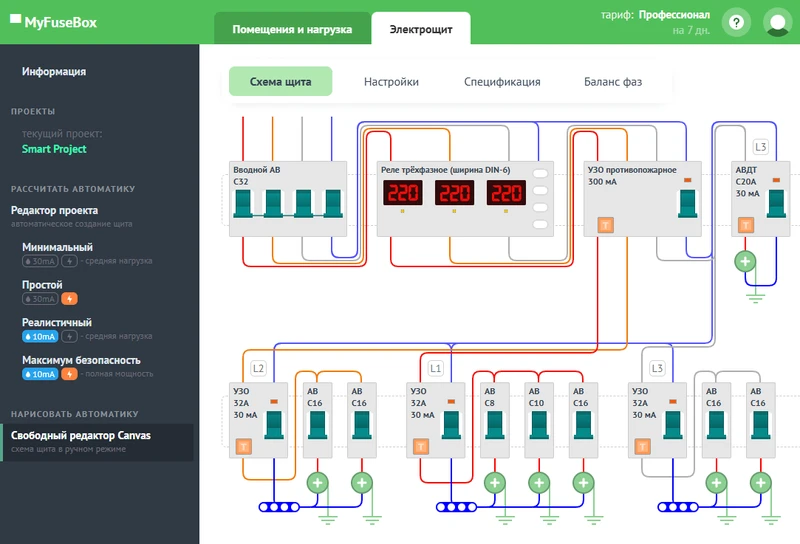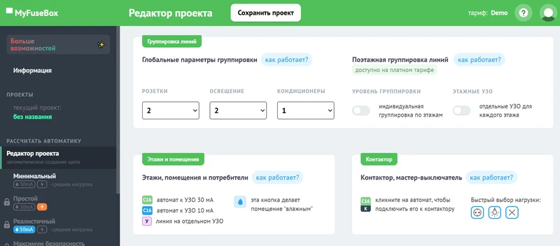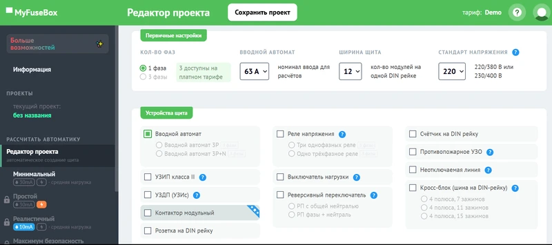 - автоматический расчет номиналов автоматов и УЗО на основе нагрузки;