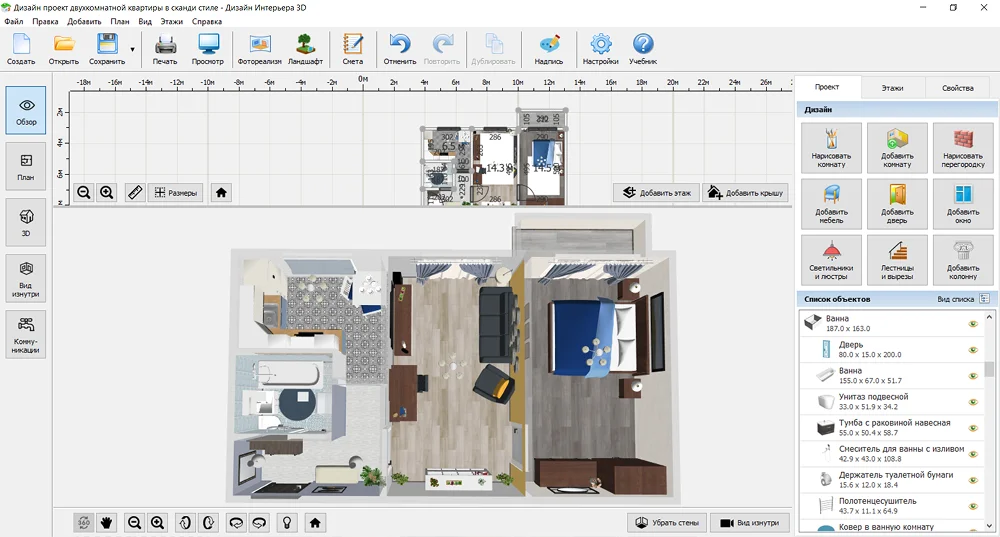 Программа для дизайна интерьера, в которой можно продумать план будущей квартиры, а затем подсчитать расходы. Для оформления в каталоге есть 1400+ текстур для отделки, более 900 моделей мебели, освещения, декора и техники. Когда сделаете проект помещения, Дизайн Интерьера 3D сделает расчет сметы на основе объема стройматериалов: вам нужно будет только указать, сколько они стоят. Вы увидите, как разные приемы влияют на бюджет, и скорректируете план при необходимости.
