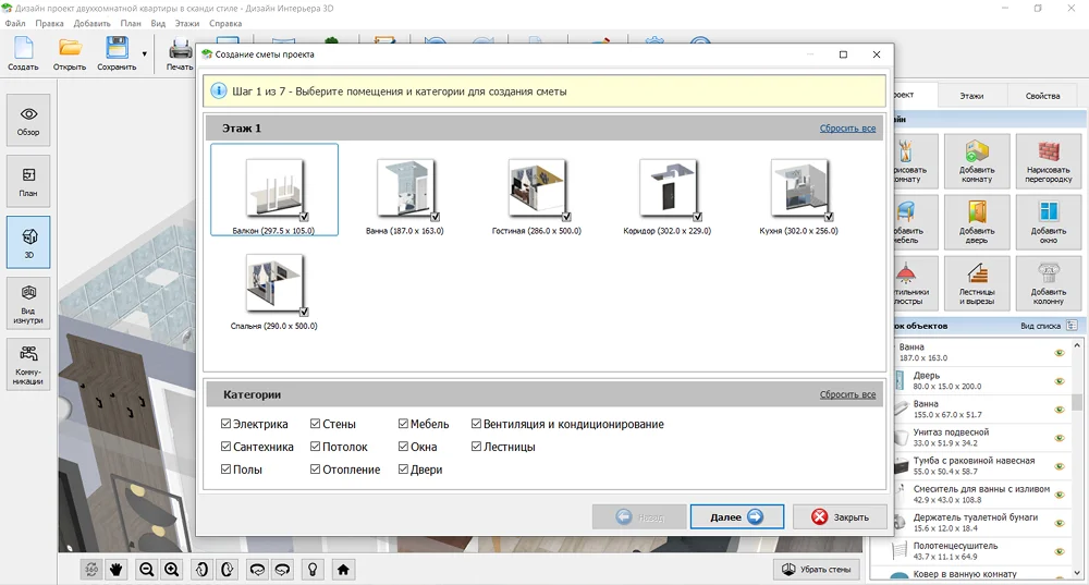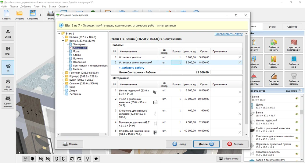 Если важно не только посчитать бюджет, но и заранее продумать планировку помещения, подойдет Дизайн Интерьера 3D: оформление квартиры и подсчет стоимости будут находиться в одном месте.